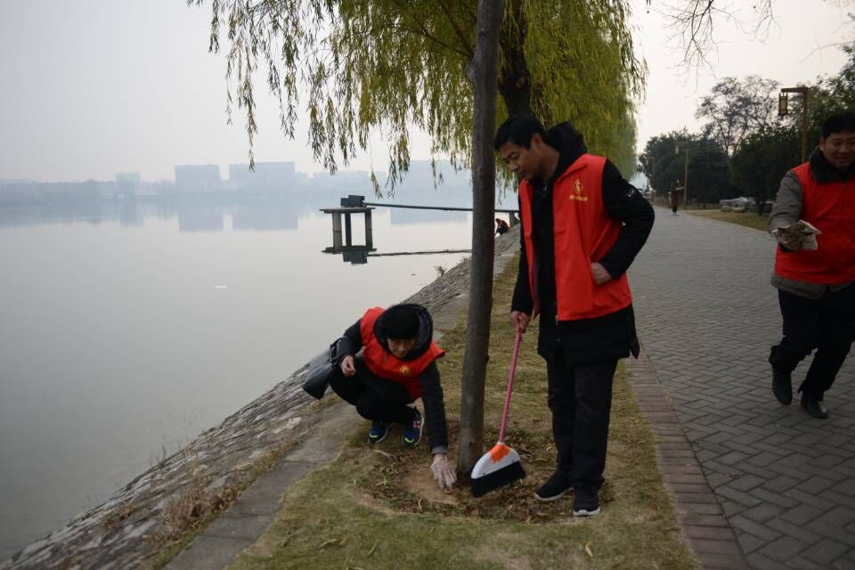 党员志愿者们身穿红色志愿服,沿白河人行步道沿途捡拾废弃物。寒风不时吹来,但党员志愿者们没有退缩,他们用笤帚等工具甚至直接用手捡拾路边、草丛、花坛里的垃圾。老师们分工明确,相互配合,有的垃圾藏在石缝中,飘在河面上,他们就用木棒一起把它们打捞上来,让美丽的白河更加干净迷人。